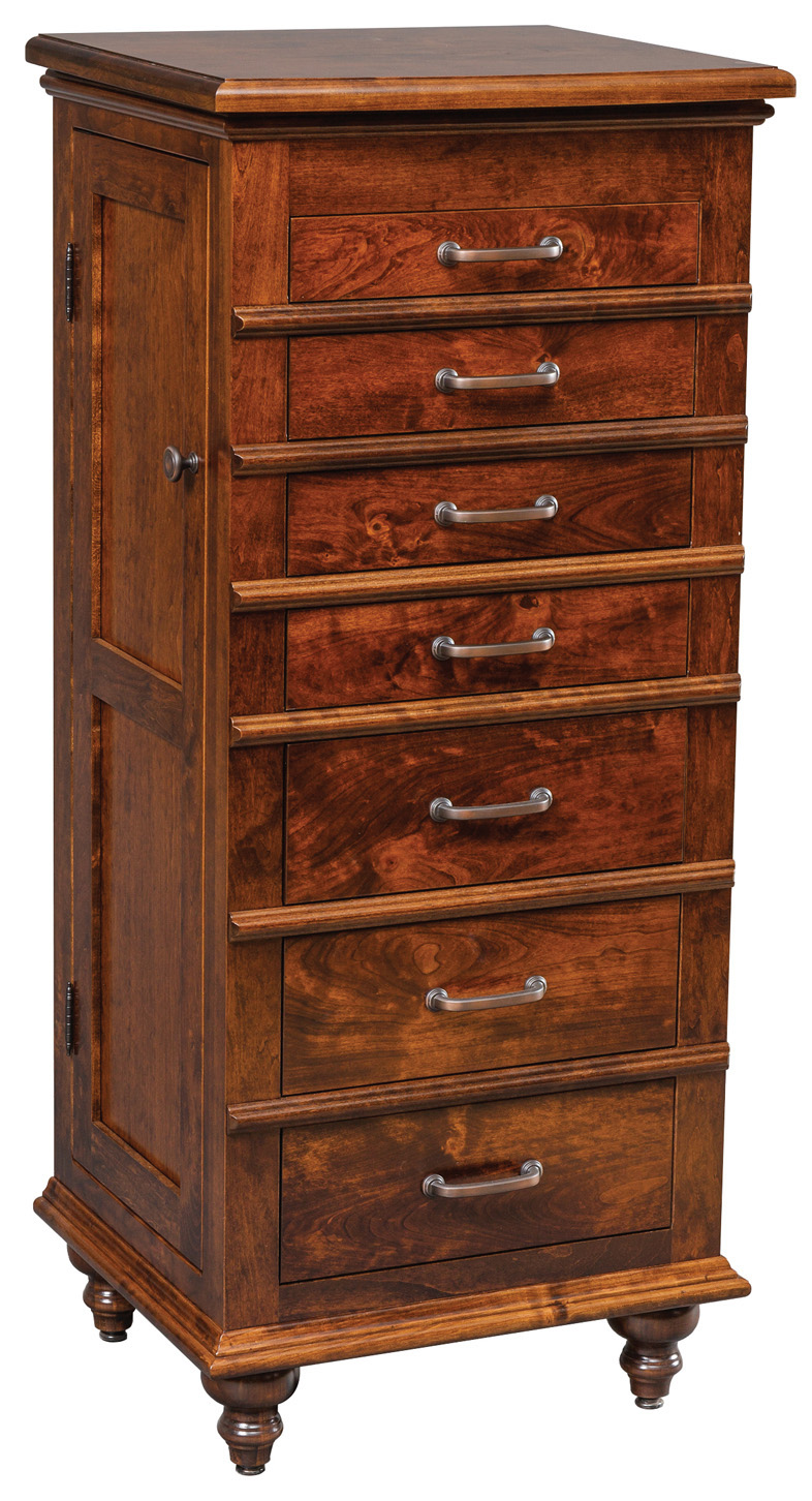 The Plymouth Jewelry Armoire offers a refined blend of traditional charm and handcrafted quality, built from solid wood by skilled Amish artisans in the USA. With its graceful contours, beveled edges, and subtle detailing, this Amish jewelry armoire brings a touch of sophistication to any bedroom. Inside, you'll find a thoughtfully arranged interior with velvet-lined, dovetailed drawers, side doors with necklace hooks, and a lift-top mirror compartment—designed to keep your jewelry organized, protected, and easily accessible. Each piece is finished with care to showcase the natural beauty of your chosen hardwood, making the Plymouth a timeless storage solution with lasting character.